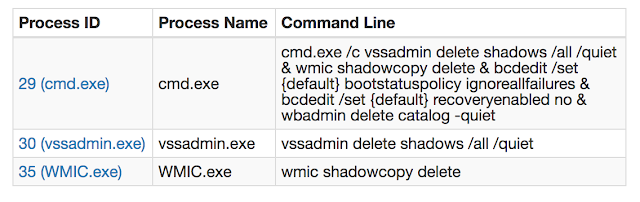Typical of other ransomware variants, the malware also deletes any shadow copies on the victim's machine in order to make recovery more difficult. It achieve this by using WMIC.exe, vssadmin.exe and cmd.exe.