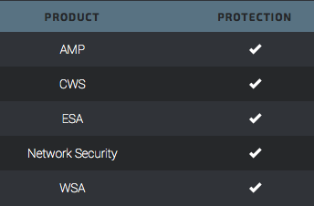 Advanced Malware Protection (AMP) is ideally suited to prevent the execution of the malware used by these threat actors. CWS or WSA web scanning prevents access to malicious websites and detects malware used in these attacks.The Network Security protection of IPS and NGFW have up-to-date signatures to detect malicious network activity by threat actors. ESA can block malicious emails sent by threat actors as part of their campaign.