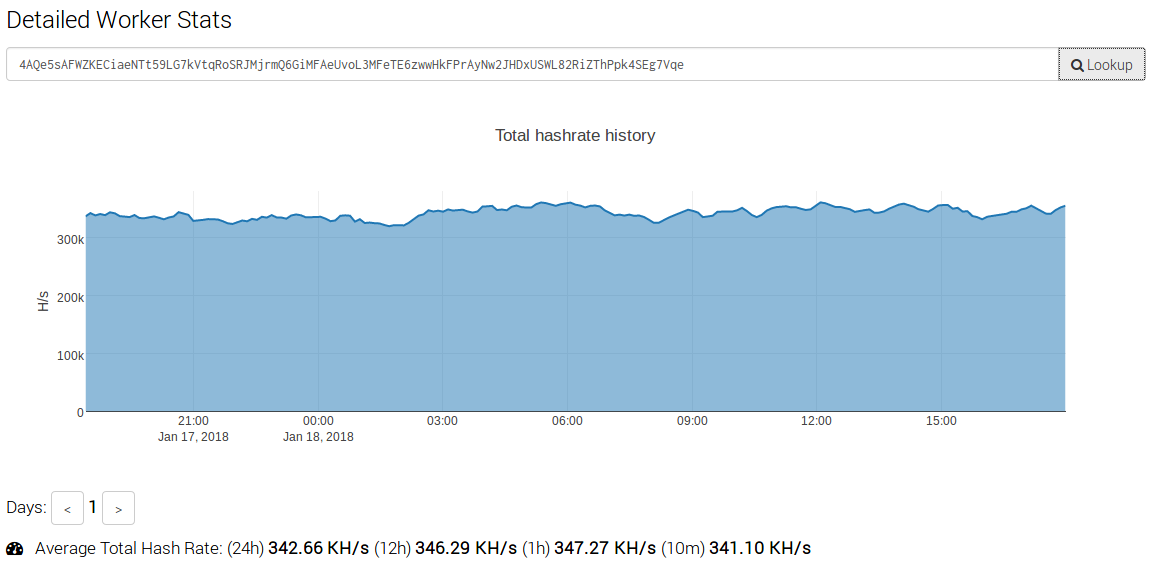 43Z8WW3Pt1fiBhxyizs3HxbGLovmqAx5Ref9HHMhsmXR2qGr6Py1oG2QAaMTrmqWQw85sd1oteaThcqreW4JucrLGAqiVQDwe began digging into the amount of hashes this system is mining. What we found was a worker that was fluctuating between 25 KH/s and 60 KH/s. Taking the average at 42.5 KH/s, this actor was earning about $85/Day.